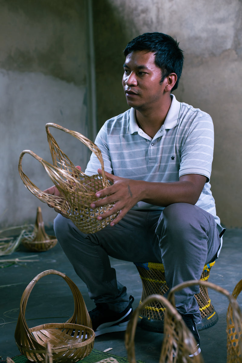 Shillong Bamboo founded by Bandabiang Dewkhaid and Tynshain Dewkhaid make innovative and eco-friendly products from bamboo and rattan cane. They received the National Entrepreneurship Award in 2019. The products presented in this collection include everyday utility and décor items all handcrafted from sustainable and natural material from Meghalaya - toothbrushes, tea strainers, baskets, lampshades, fairy lights, candles and more. Earlier specializing in bamboo construction, they then branched out to a product range with a long-term vision to promote eco-friendly substitutes to plastic and other non-biodegradable materials. The products are produced at their unit in Shillong, as well as in collaboration with traditional bamboo weaving communities spread across the different districts in Meghalaya.